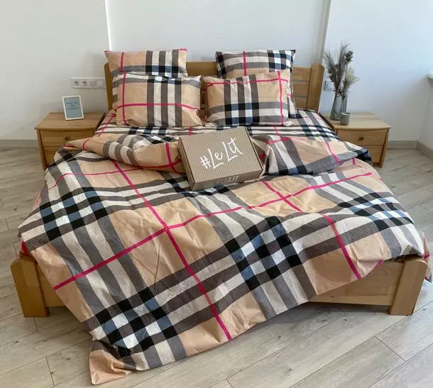 Двуспальное постельное белье LeLIT 0015 бежевое с черными и красными полосами, принт "Burberry"