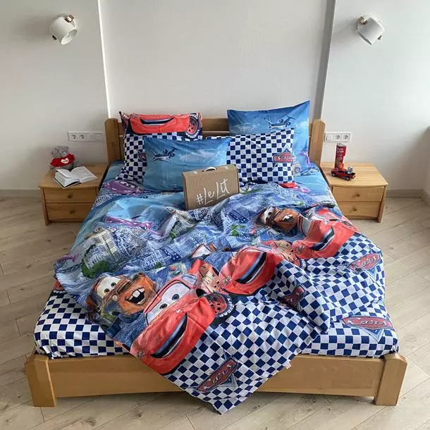 Полуторное постельное белье LeLIT 0728 сине-голубое с красным, принт "Тачки"