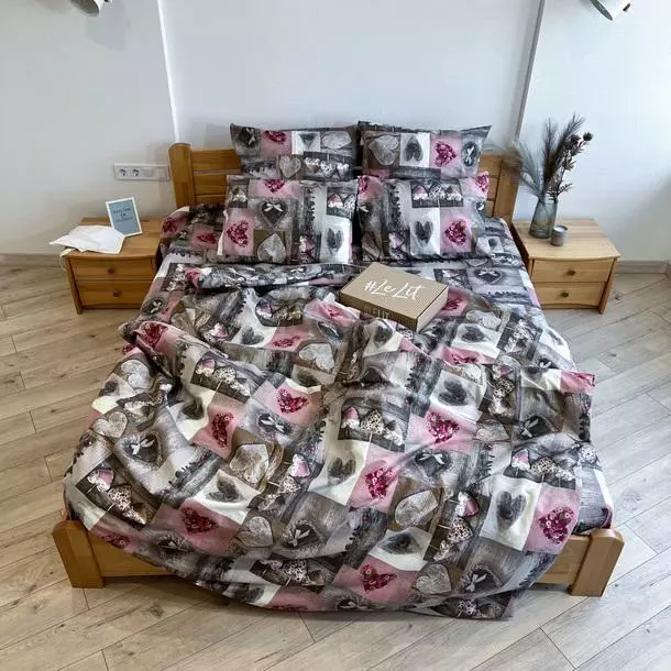 Семейное постельное белье LeLIT 0002 серо-белое с розовым, принт "Сердца"