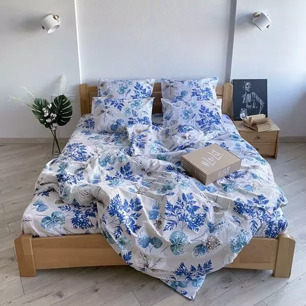 Семейное постельное белье LeLIT 0834 бежево-голубое с принтом "Листва"